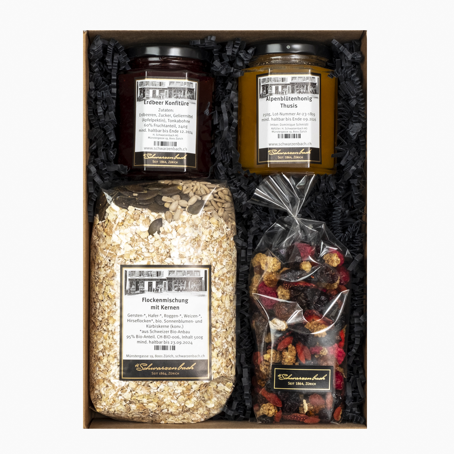 A selection of specialities for a delicious Swiss breakfast, packed in a brown gift box: