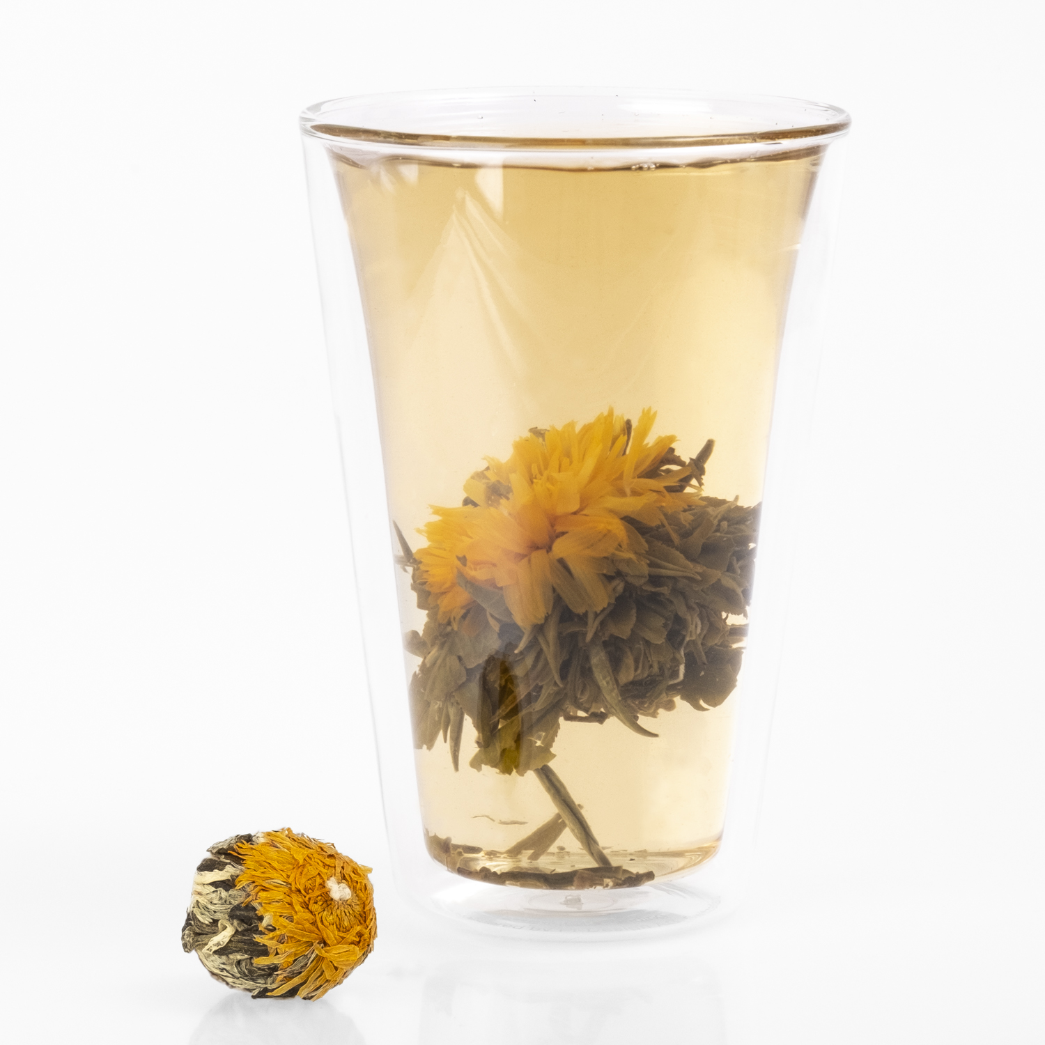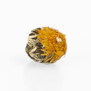 Green tea from Yunnan, enhanced with natural peach flavor and carefully shaped into a ball with marigold petals. This artful composition produces a beautiful, aromatic, fruitily sweet infusion.