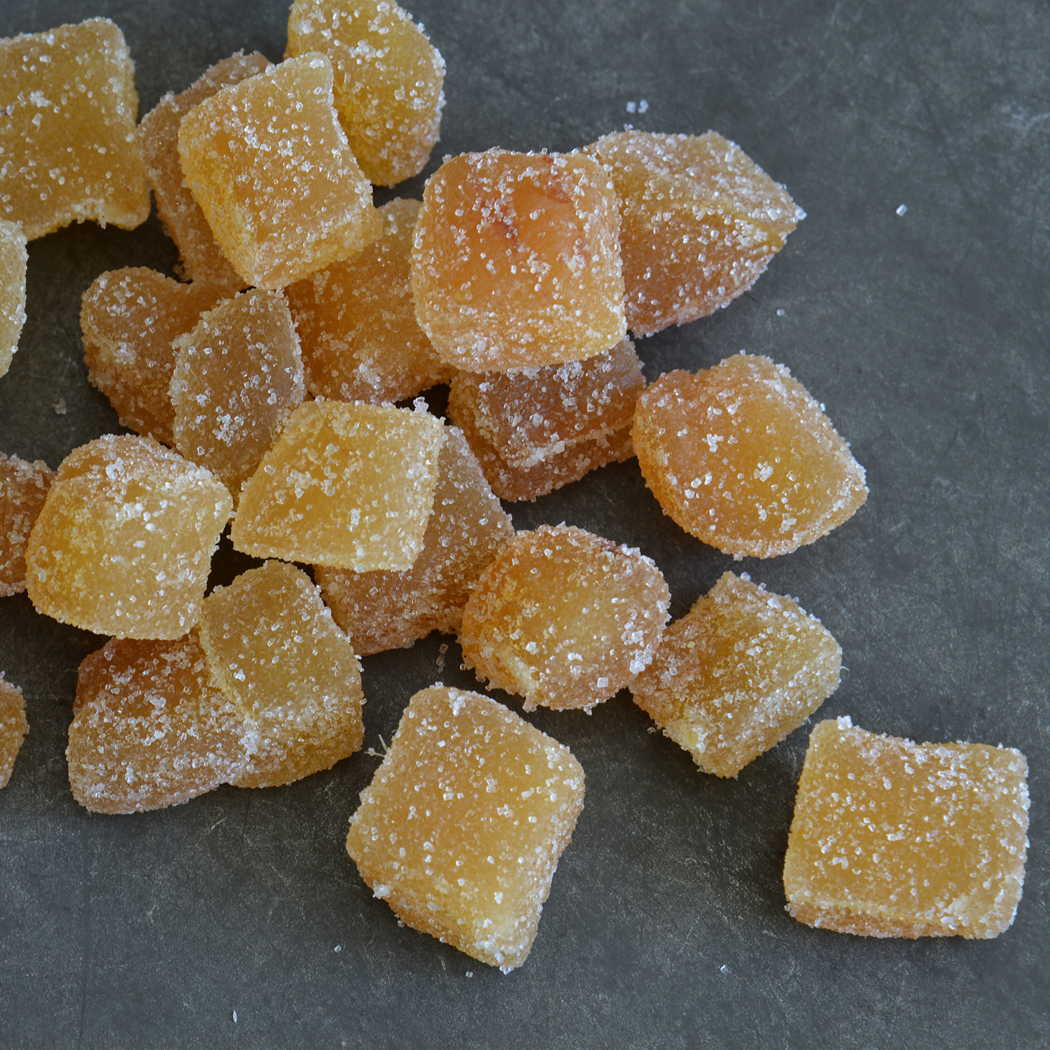 Ginger pieces lightly sugared, unsulphured and with a pleasant spiciness.
