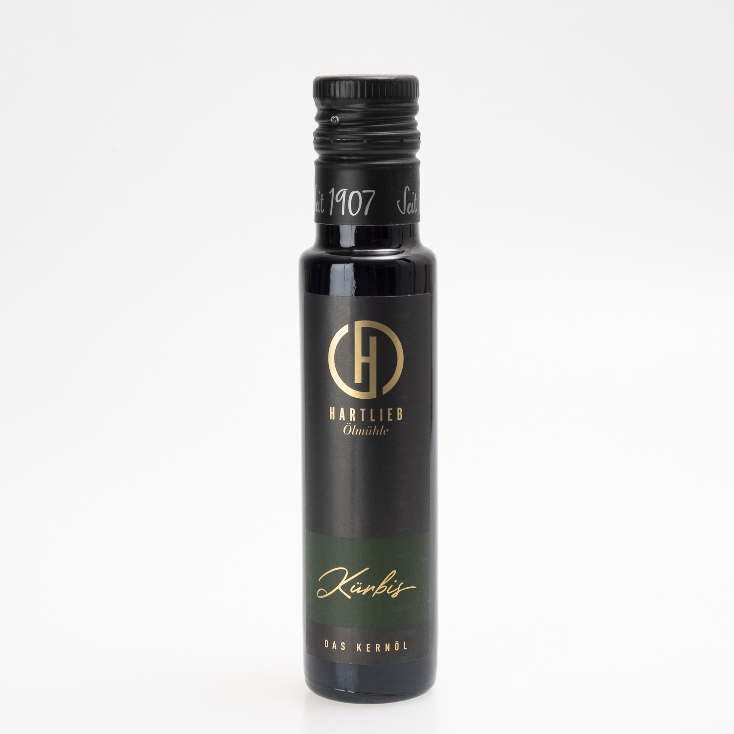 Hartlieb’s “Kürbiskernöl” is a natural oil from the first pressing of Styrian pumpkin seeds. It has a deep green to reddish brown colour and a very distinctive, typically nutty aroma with a mild roasted note of fresh bread crust and caramel. Excellent for seasoning pumpkin soups or vegetables. In combination with apple or wine vinegar, pumpkin seed oil is suitable for marinating all kinds of salads (lettuce, bean, potato, cheese, sausage or meat salads).