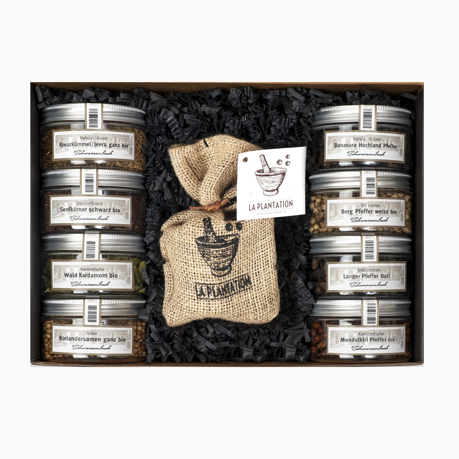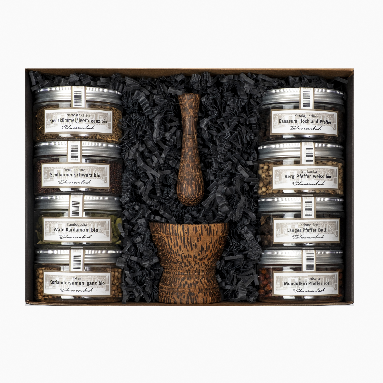 A delightful gift set including a handcrafted wooden mortar from Cambodia and a selection of exquisite spices: