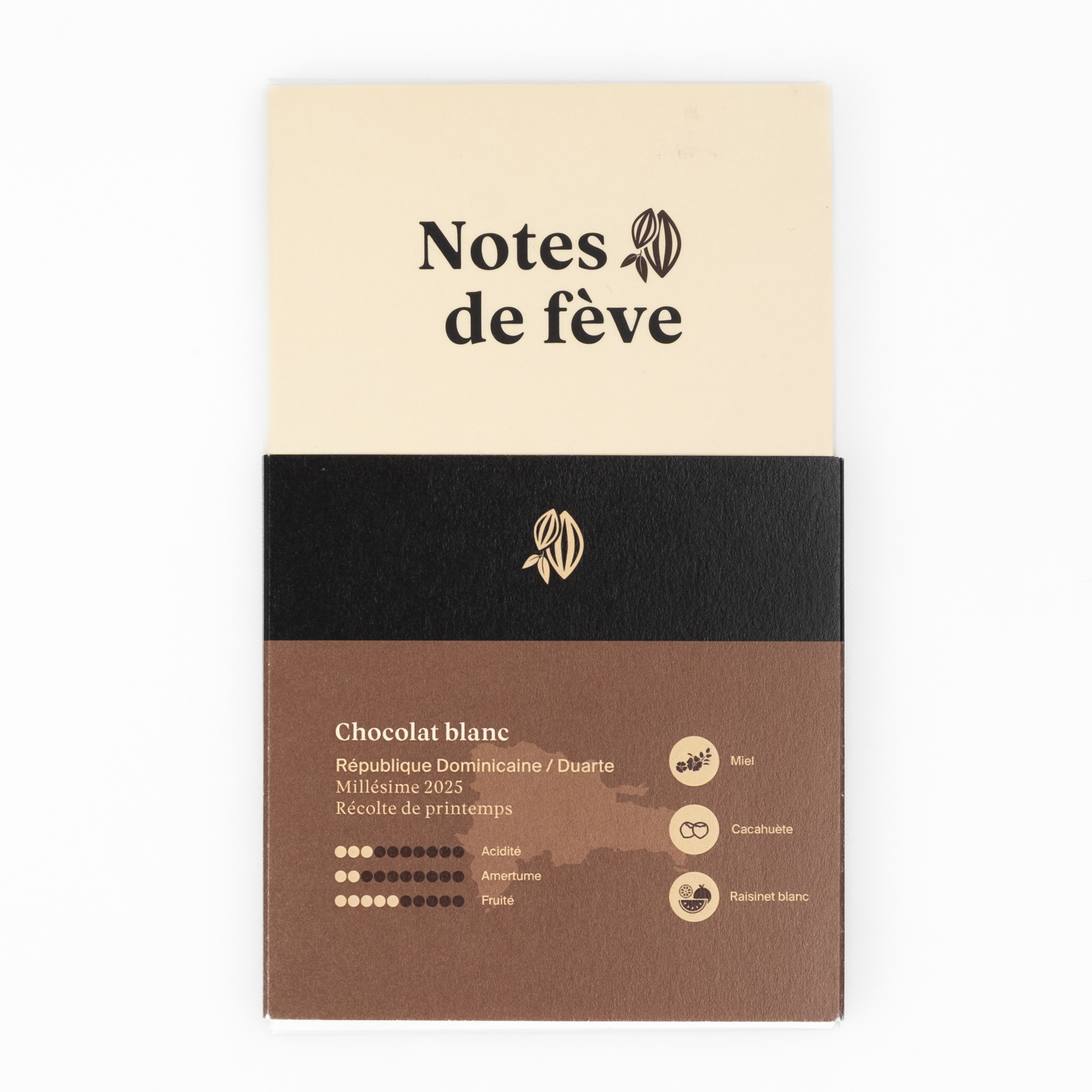 This white chocolate is made from cocoa sourced from the Öko Caribe Cooperative in the Dominican region of Duarte, where 22 smallholder farmers on small plantations contribute to the high quality of this cocoa. The fruity aromatic profile reveals notes of honey, peanuts, and white currants. A delicate buttery touch gives the chocolate a harmonious and pleasantly smooth texture.