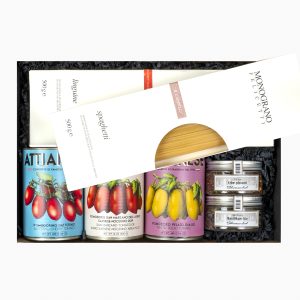 For pasta lovers: A set featuring three distinctive tomato varieties, premium organic pasta and two seasonings for an authentic pasta al pomodoro. Packaged in an elegant dark brown gift box: