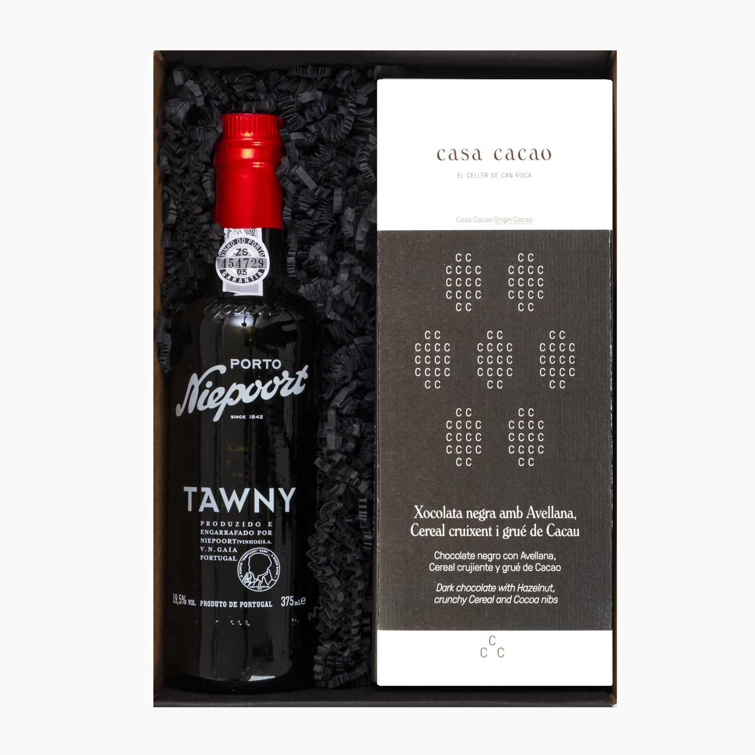 An indulgent combination: port wine and chocolate. The maxi bar of dark chocolate with hazelnuts, crispy cereals and cacao nibs from the Spanish chocolate maker Casa Cacao pairs perfectly with a glass of port. A delight to share.