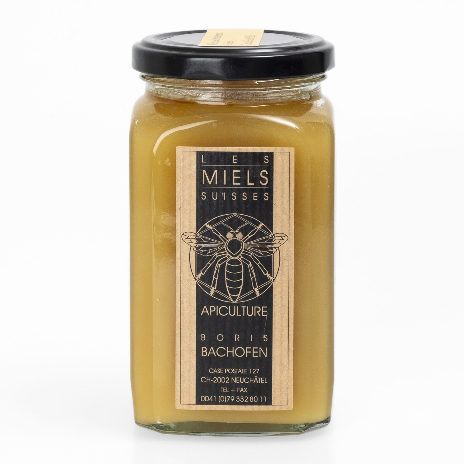 Boris Bachofen has been passionately involved in bee and treekeeping for over 35 years. He produces excellent honeys in the Lake Neuchâtel area. This light spring honey (Miel de printemps) is harvested in Corcelles and is velvety smooth on the palate and harmonious in taste with the finest malty notes.