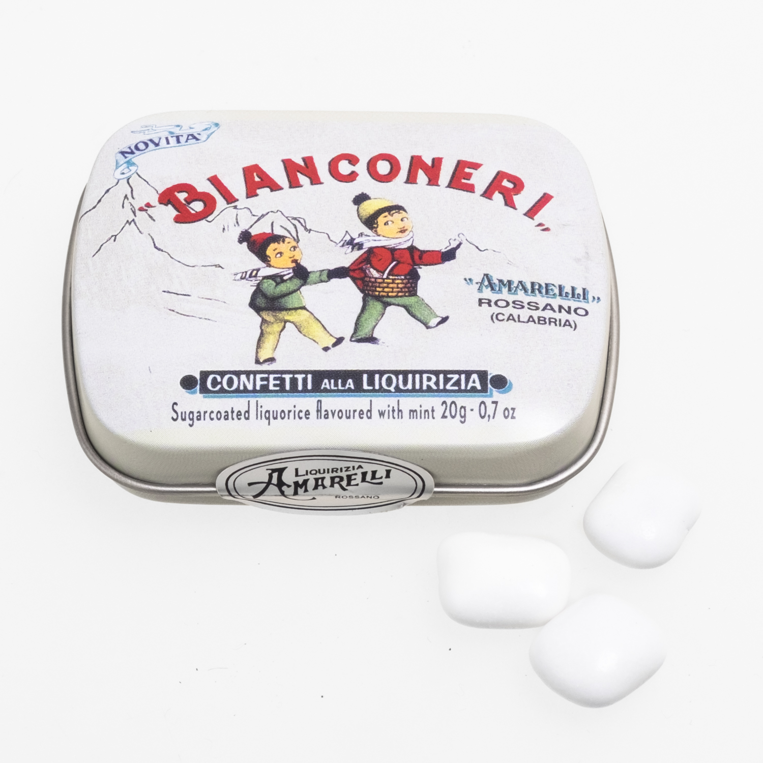 Amarelli Confettini Bianconeri (Schwarz-weiss) sind überzogene Pastillen aus weicher Lakritze mit Minzgeschmack. Erfrischend und würzig durch die knusprige Hülle und den aromatischen Kern.