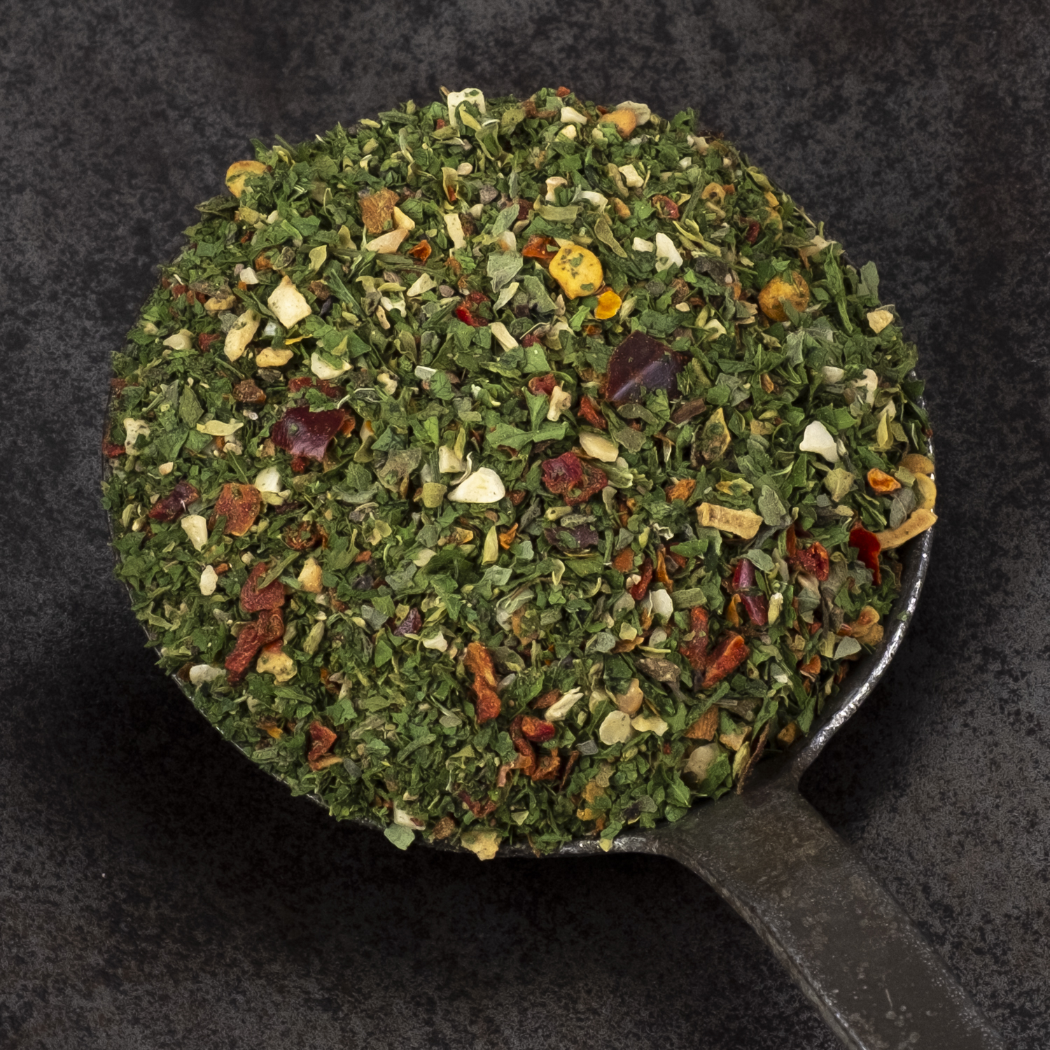 Bio Petersilie, Bio Knoblauch, Bio Paprika, Bio Pfeffer schwarz, Bio Zwiebel geräuchert (Bio Zwiebel, Rauch), Bio Tomaten, Bio Oregano, Bio Chili, Bio Pfefferminze