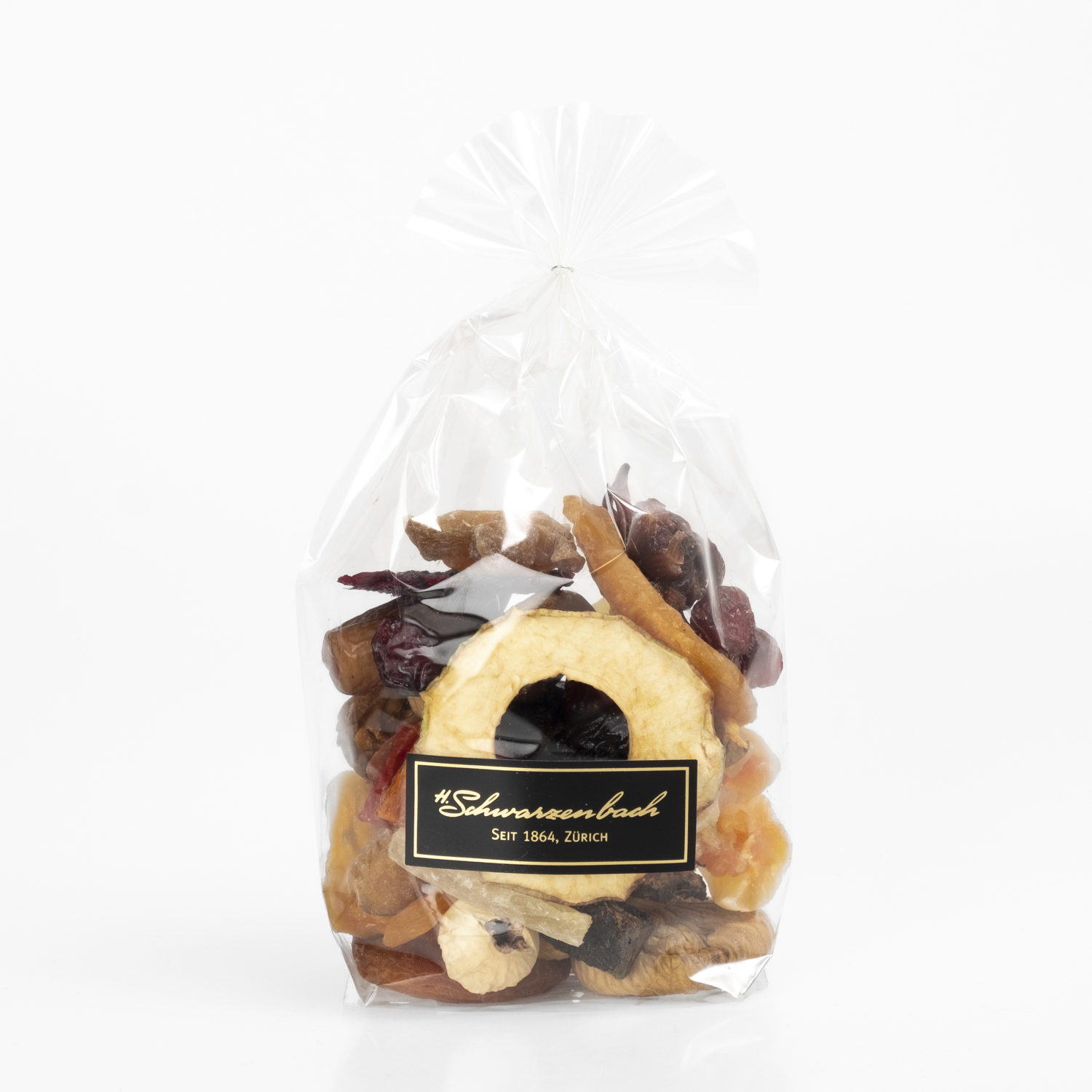Feigen Türkei; Bananenstreifen Iran; Ananasmark Thailand (Konservierungsstoff: E330, Zucker); Datteln Tunesien; Aprikosen Türkei (Konservierungsstoff: E220*1), Apfel Schweiz; Birnen Schweiz (Scheiben/natural), Birnen Südafrika (Konservierungsstoff: E220*1); Drachenfrüchte Thailand (natural, Reismehl), Pfirsiche Südafrika (Konservierungsstoff: E220, Sonnenblumenöl)*1;Pflaumen Frankreich *1); Pflaumenscheiben Iran, Mango Thailand (natural); Papaya Thailand (Zucker); Wilde Feigen Iran, Preiselbeeren Lettland, Kiwi Iran, Feigenscheiben Iran, Blutorangenscheiben Iran, Hibiskusblüten Thailand (Rohrzucker, E330).