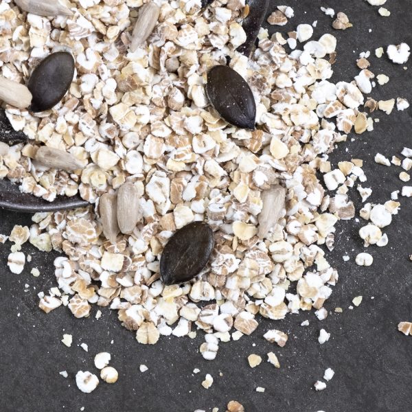 Eine biologische Flockenmischung mit Gersten-, Hirse-, Hafer- und Roggen- und Weizenflocken aus Schweizer Anbau, angereichert mit Schweizer bio Sonnenblumen- und Kürbiskernen.