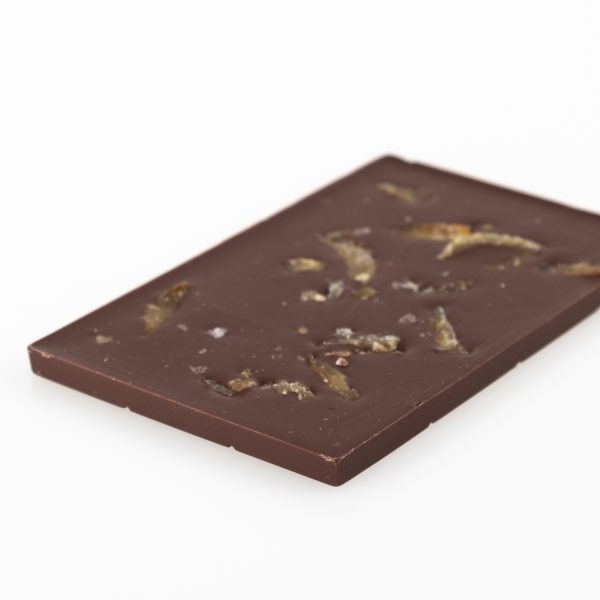 Cremige Tansania 54%ige dunkle Milchschokolade mit getrockneten Yuzu-Schalenstücken und Meersalzflocken.