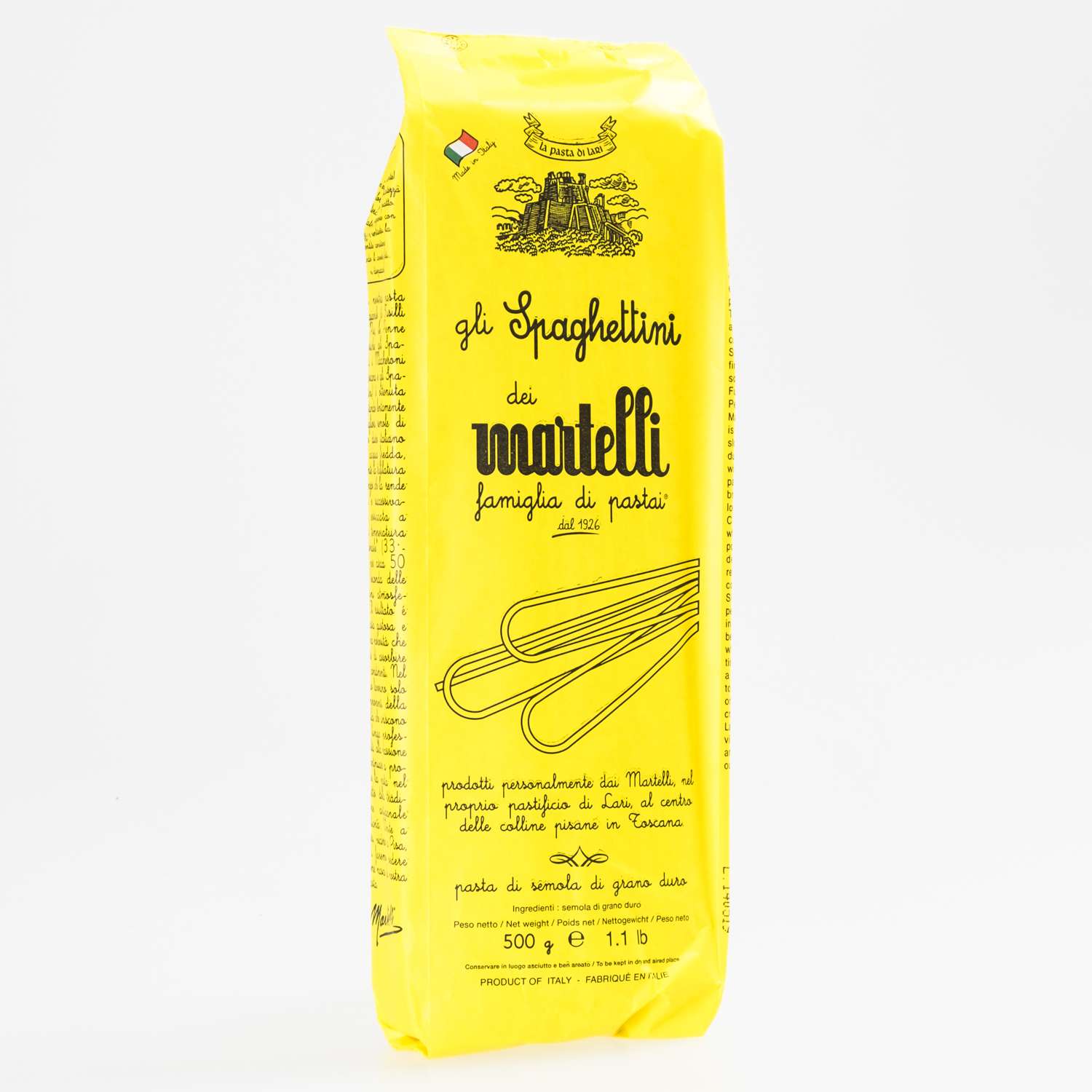 Spaghettini von Martelli werden in der Toskana mit der höchsten Handwerkskunst hergestellt. Ihre besondere Qualität und Beschaffenheit erhalten die Spaghettini durch das langsame Mischen des Teiges. Dieser besteht nur aus bestem Hartweizengriess und Wasser. Danach wird er durch Bronzeformen gepresst, wodurch die Pasta ihre typische raue Oberfläche erhält.