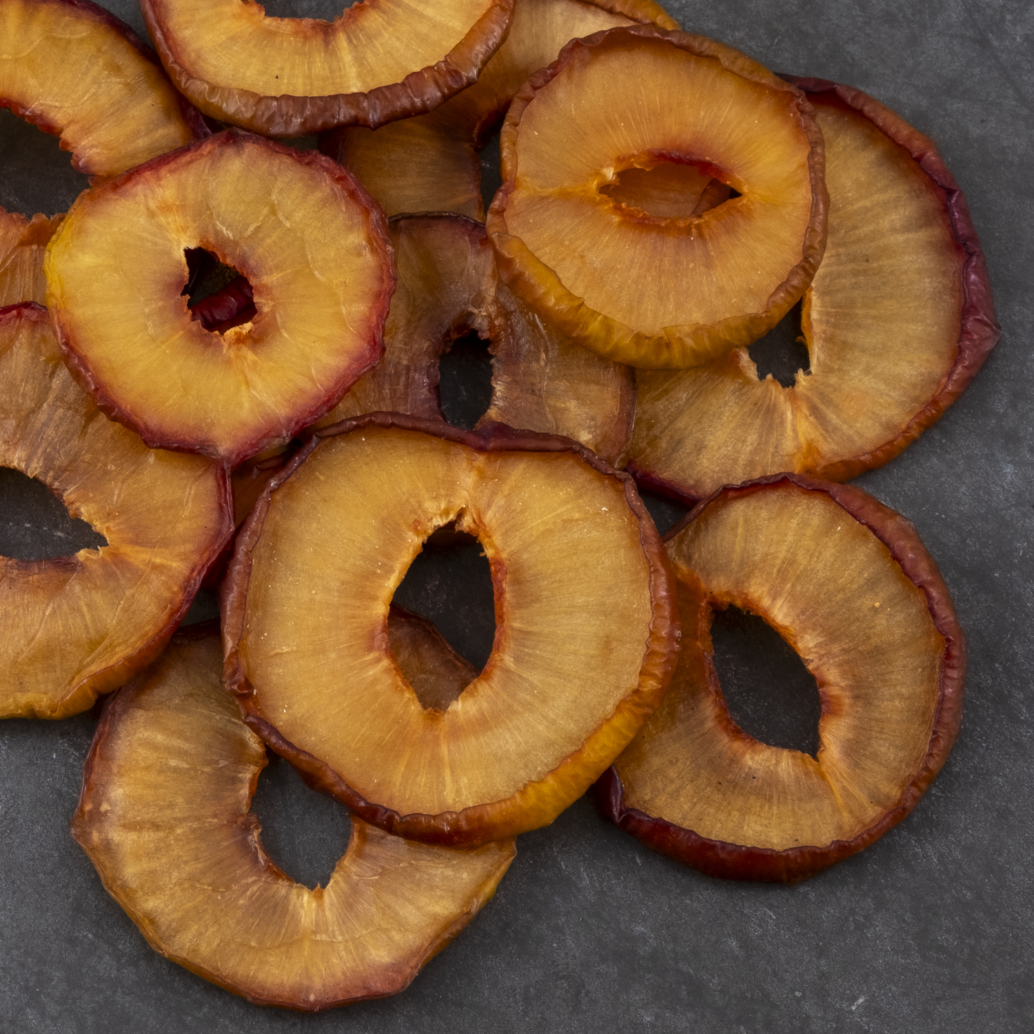 Getrocknete, säuerliche Pflaumenscheiben aus den hell-rötlichen Pflaumen. Beliebt als Wanderproviant, als Snack für zwischendurch oder als Zutat für Müsli, Salate, oder Desserts.
