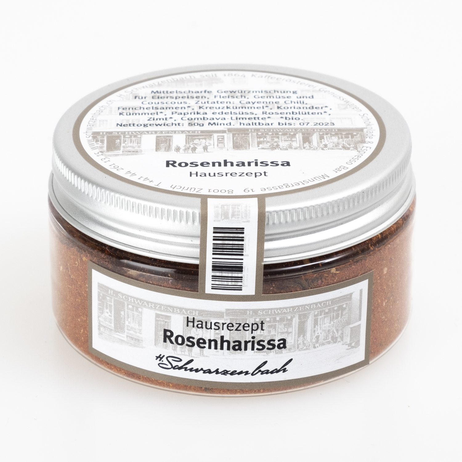 Hausgemachte Gewürzmischung mit Cayenne-Chili, Fenchelsamen, Kreuzkümmel, Koriander, Kümmel, Paprika, Zimt, Combavalimette und Rosenblüten.