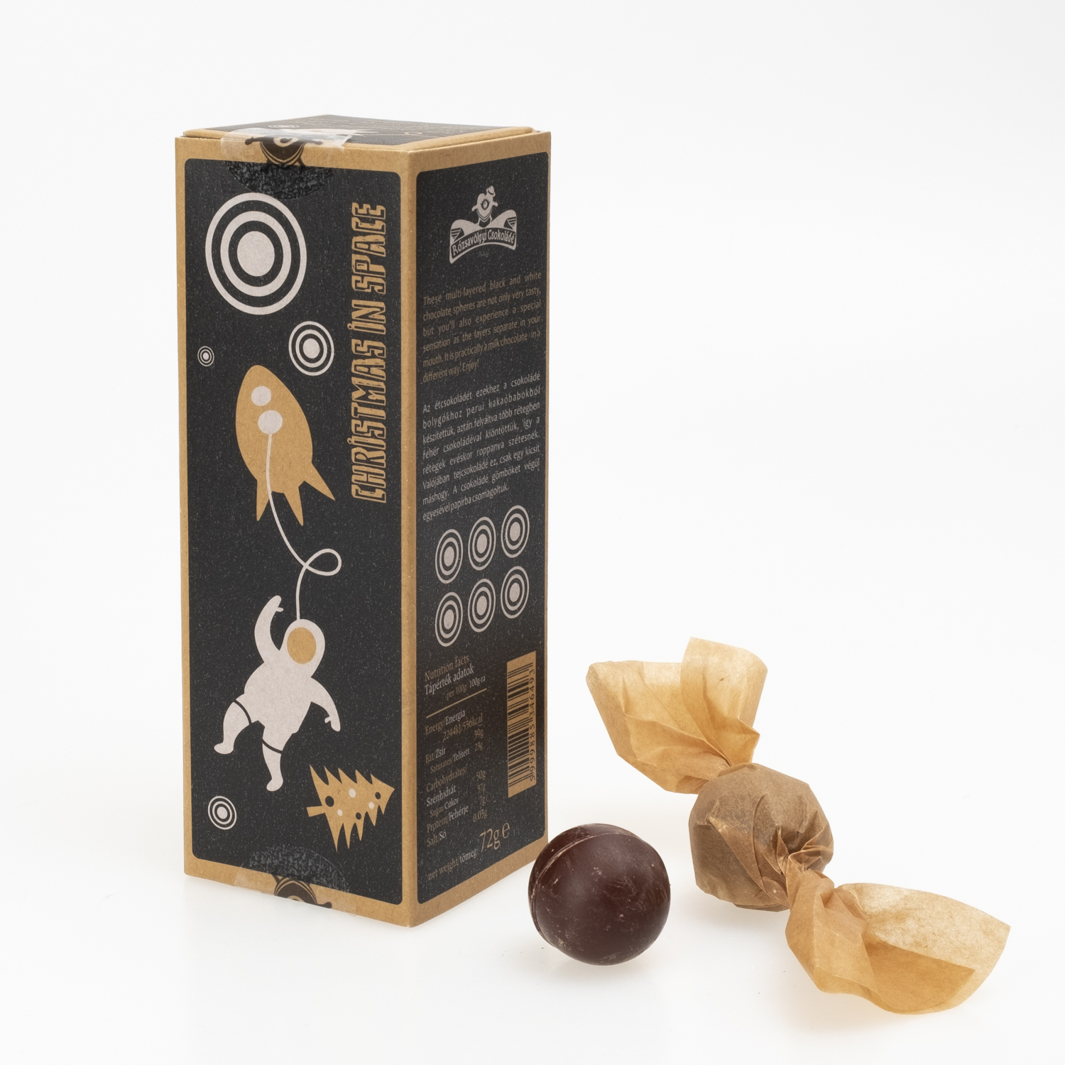 6 Schokoladenplaneten mit dünnen Schichten aus dunkler und weisser Schokolade.